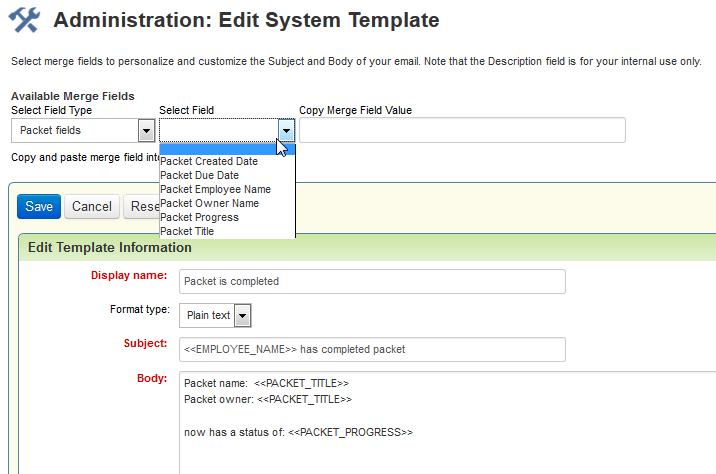 As with the other status trigger notifications, you must have an email template set up first in order to use this feature. No new email templates have been added, so you must create one. New merge fields have been added for this purpose. When setting up an email template, you can choose ‘Packet fields’ from the first drop down, and then select from several merge fields to create an email template to indicate that the packet has been completed.