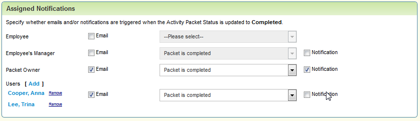 Onboard customers can now set up email and system notifications triggered by the completion of an entire packet. Emails cannot be sent for individual activities. These emails or notifications can be sent to the employee, the employee’s manager, the packet owner, or a designated user.