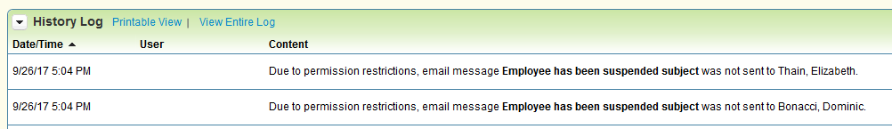 There has been a change to status trigger notifications of all types (Recruit, Perform, and Onboard) when selecting specific users. In previous releases, users who didn’t have direct access to the information were not sent the email, even though the email was just informative rather than a link to document. For example, if you listed as user to receive a status trigger email for the status of a requisition, but the user wasn’t an owner, then the email would not be sent. Instead the history log would show permission errors such as these: