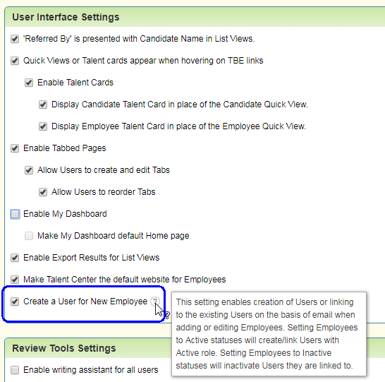 - At the bottom of the User Interface Settings section, check the option for Create a User for New Employee.