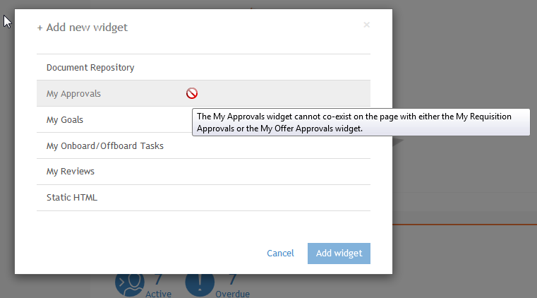 - If the My Approvals widget is grayed out, this indicates that either the My Requisition Approvals or My Offer Approvals widget is already on the page. Cancel and delete both of those widgets before trying again.