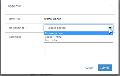 For example, in the image below, Julie Fox is logged into the Talent Center. Julie is the proxy approver for Anna Cooper, but she is also a designated approver for this same offer. So when she goes to approve, she will have the option of approving on behalf of Anna, or herself.