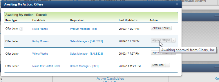However, when logged into TBE, the offers will still appear on the My View or My Dashboard pages, but the Approve/Reject button will be grayed out, and if you hover over the button you will see a note that the requisition is awaiting approval from the current approver.