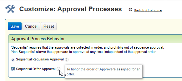 NOTE: The last release introduced sequential approvers for requisitions, and this setting has now been moved to a new location. Both the offer and requisition settings are in the same location. The value of your requisition setting will remain the same after this release, but it is located in a new place.
