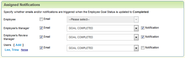 Perform customers can now set up email and system notifications triggered by the status change of an employee goal. These emails or notifications can be sent to the employee, the employee’s manager or review manager, or a designated user.