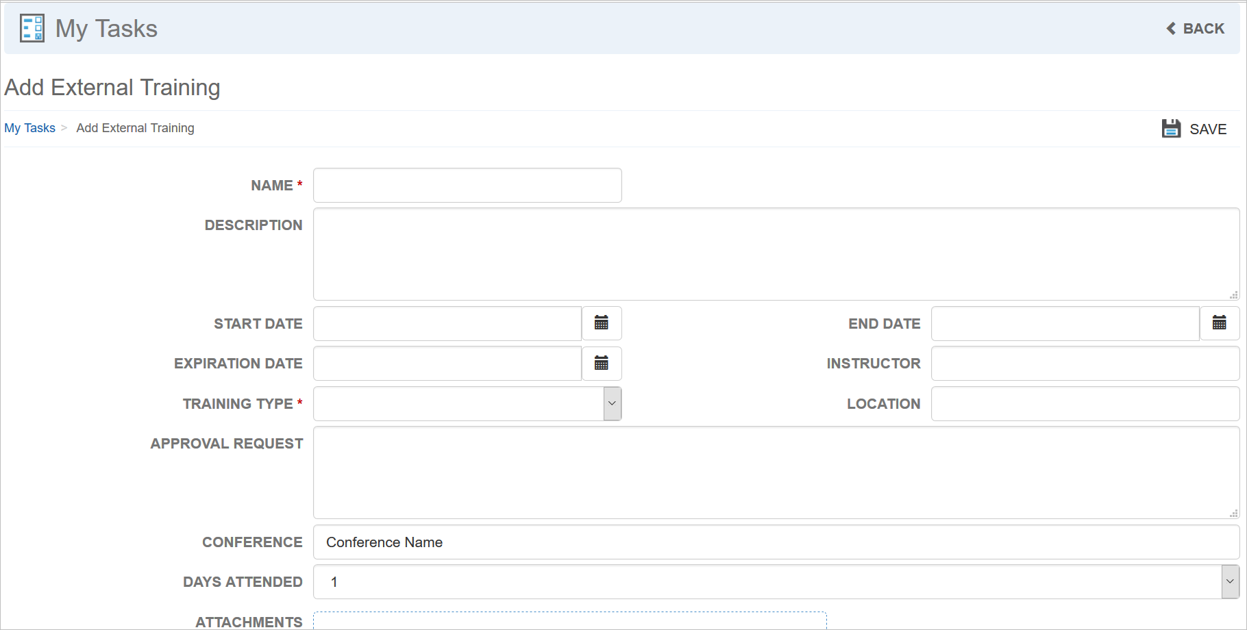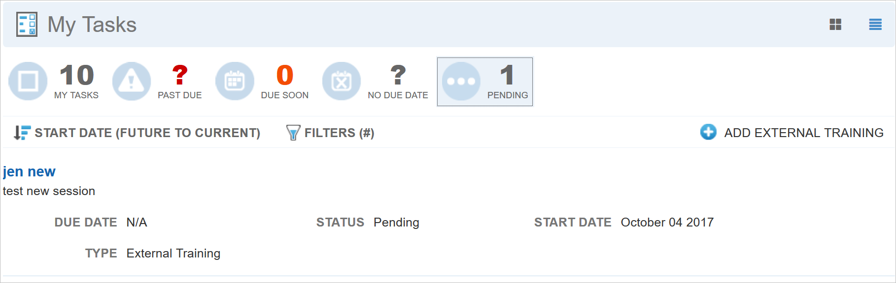 NOTE: This section is only visible if you have selected the External Trainings check box from the Show Selected Types in My Tasks section.