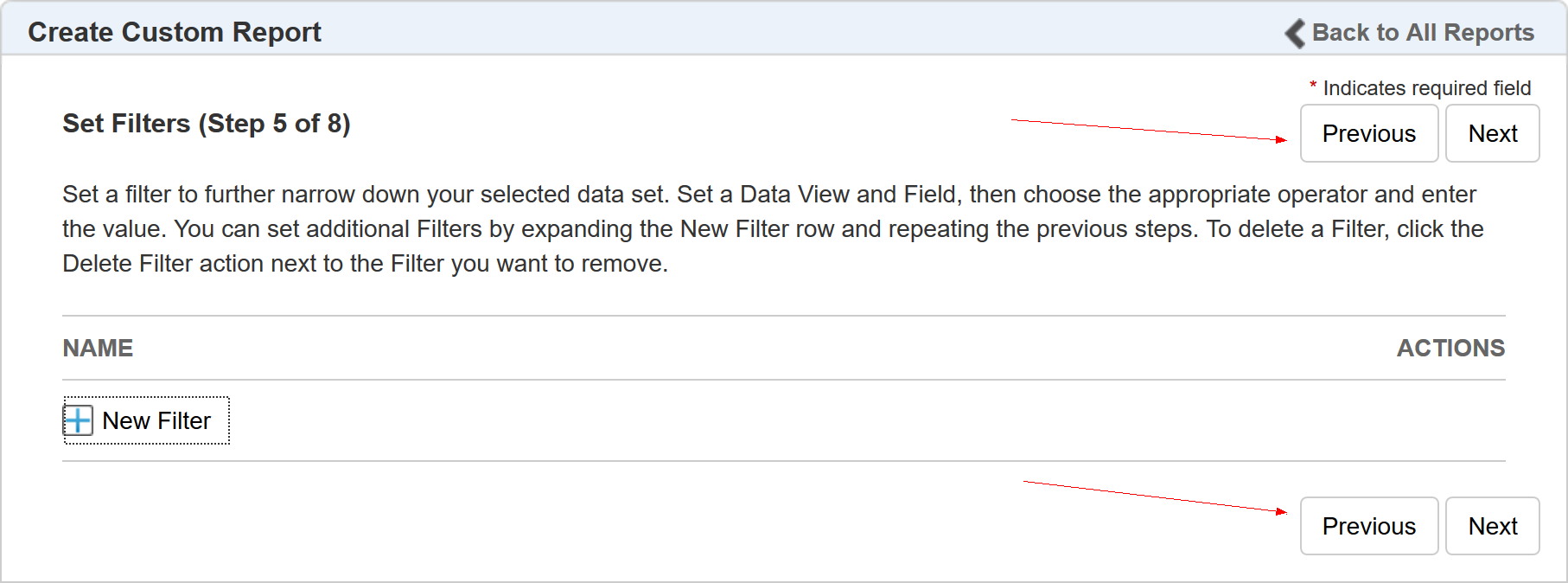 Previous and Next Buttons Now Display at the Top and Bottom of Custom Report Setup