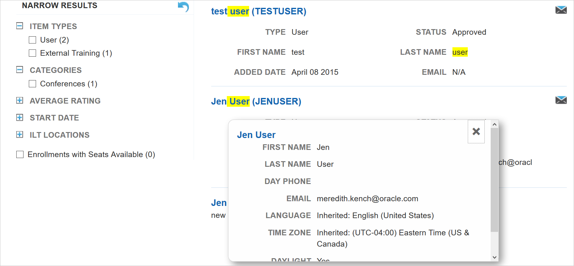 Two enhancements have been made to the Search Widget, which is accessible from both the Search and Catalog Widgets. The first is the availability of User Cards. If your LearnCenter is configured to display User Cards, any time you click a User’s name in the Search Widget’s search results, that User’s User Card displays.