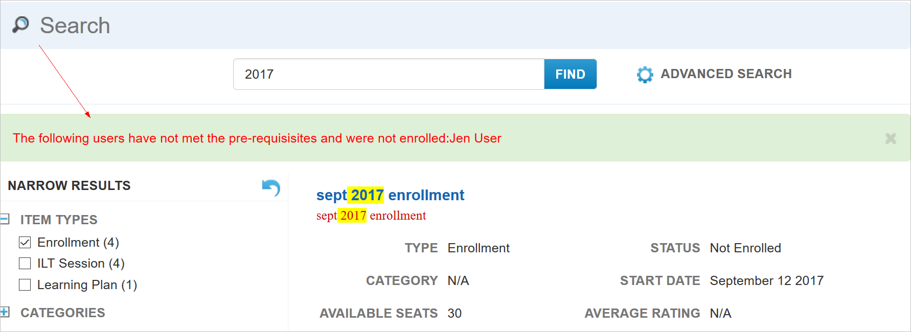 The second enhancement involves better validation with regard to Prerequisites. When Supervisors assign Enrollments from the Search results, LearnCenter checks to see whether a User has completed required Prerequisites. If Users have completed an Enrollment’s Prerequisites, they can be assigned to it. A confirmation message displays to let the Supervisor know that they were assigned.