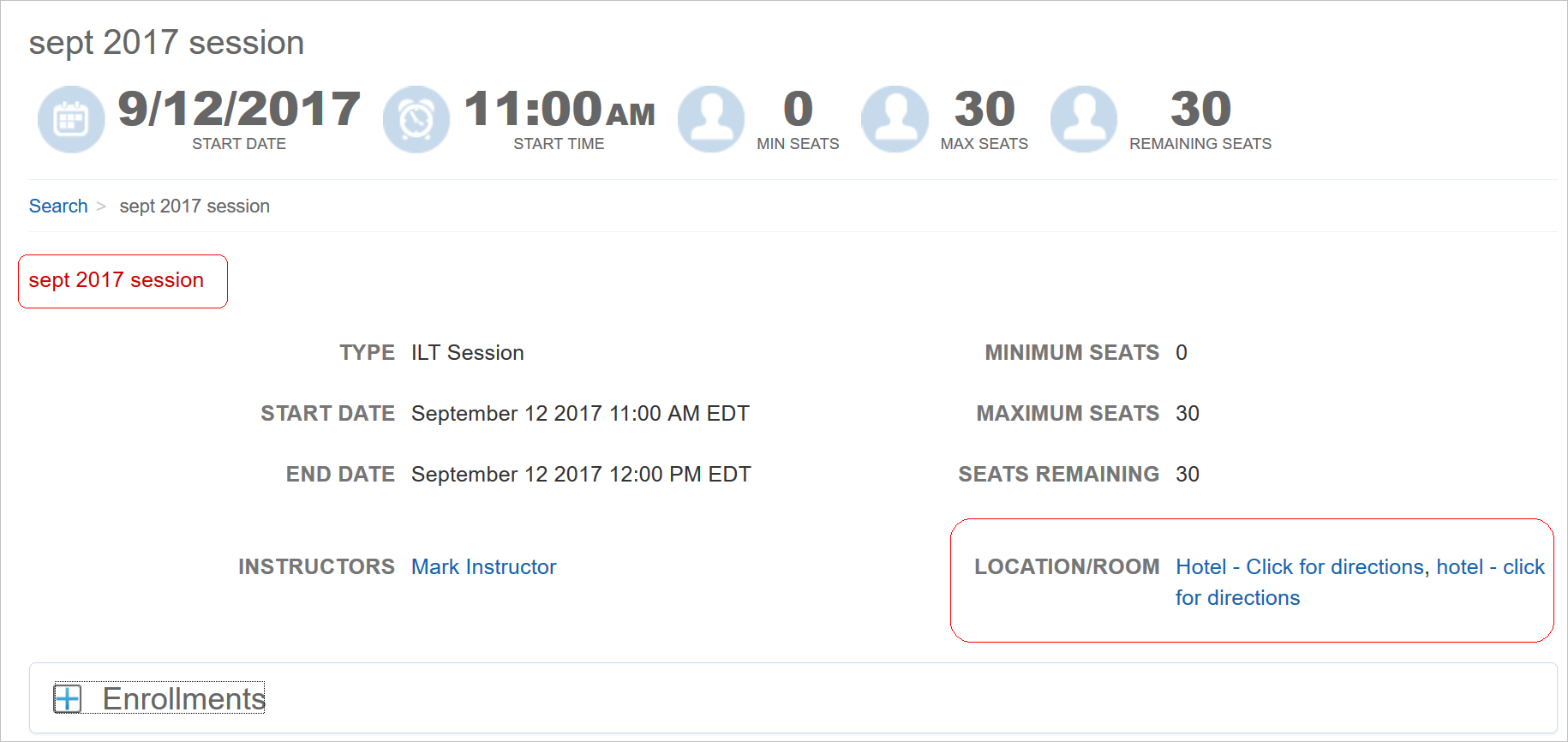 In the example above, both circled items are rendered HTML tags. For the Location/Room field, the Admin used an URL to include a map to the session location.