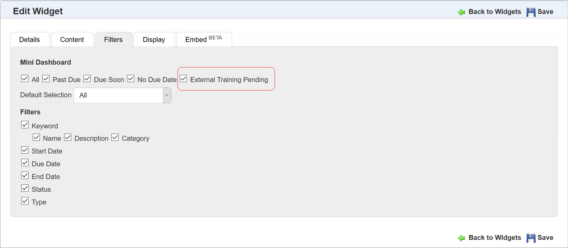 Click the check box to include any pending External Training events to end Users. By default, the new check box is not selected. There is also a new External Training Pending check box in the Mini Dashboard section of the Filters tab.