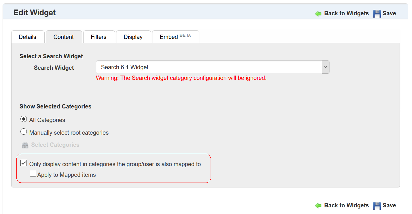 The Only display content in categories the group/user is also mapped to check box (available on the Content tab of either the Catalog or Search Widget setup) enables you to display only the items that are mapped to the same Categories to which the end User or Group is also mapped. What this means is: