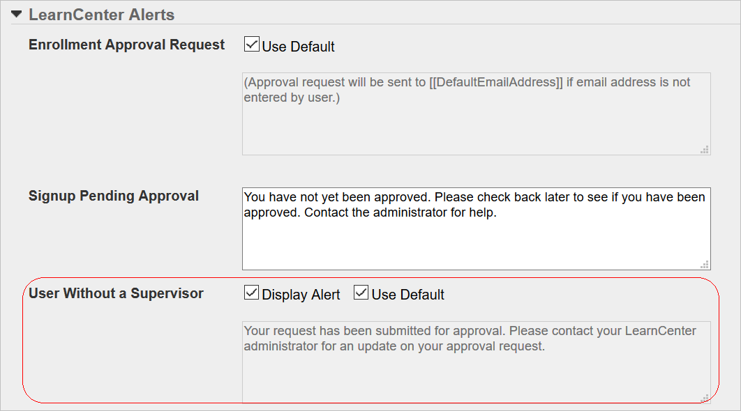 This alert displays to Users who have no Supervisors when they self-map or self-register for training that requires supervisor approval. No Communication Messages are sent, but the designated Administrator can view and approve the pending or nominated requests. You can use the default LearnCenter text, or clear the Use Default check box and write your own message.