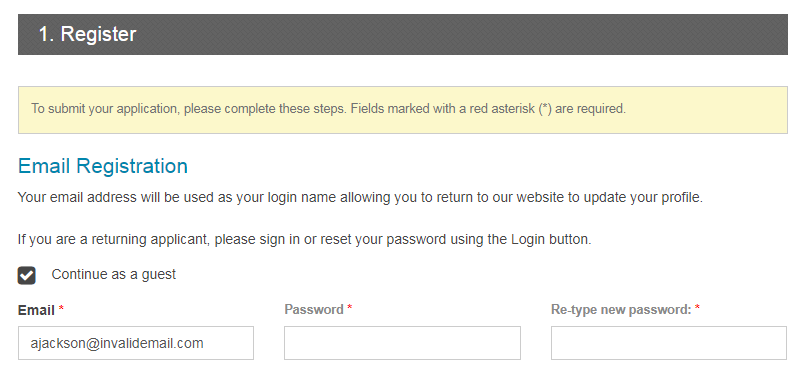 Once saved, job seekers will see the option to continue as a guest above the email and passwords field. The password fields will be disabled when selecting this option.