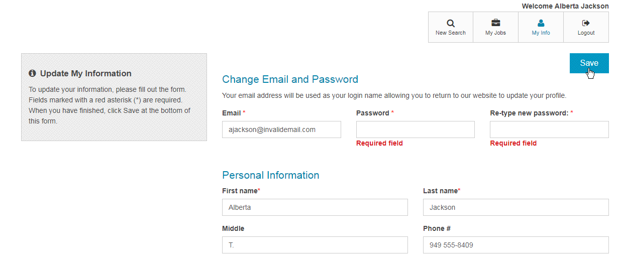 If the job seeker clicks on the My Info option after completing the application, any attempt to save will require a password, and at that point, the job seeker would no longer be a guest once the password is saved.