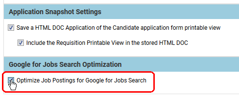 Career Centers may now be flagged to optimize requisitions for inclusion in Google for Jobs search results. Requisitions will include the structured data specified by Google for inclusion in Google for Jobs.
