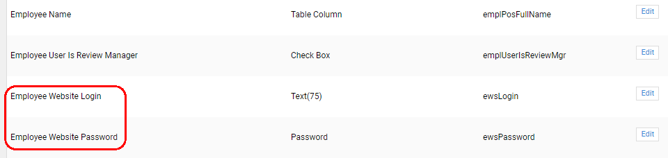 NOTE: If you previously used the Employee Website (EWS) your fields may still be named Employee Website Login and Employee Website Password. It is recommended that you change the display name of these fields, simply removing the word ‘website’ from the names. You may do this from the list of standard Employee fields. The external name can rename the same.