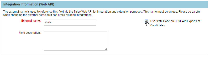 A new option for the Employee and Candidate State/Territory fields offers the choice of the state code or state name in REST API exports of Employee and Candidate records. This only applies when both the state code and name are used and separated by a pipe(|) symbol, such as California|CA. Currently, the REST API’s use the state name for Candidate and Employee exports.