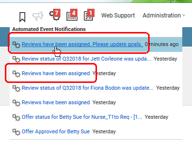 The reviews are available very quickly, depending on the number assigned. From the Auto Events icon, you will see a notification, and the message that appears depends on if any of the selected employees have goals that can be included in the reviews.
