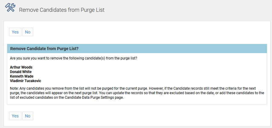 - Once you have excluded all desired candidates by removing them from the list, click Confirm Candidate Purge at the top of the screen. You do not need to select any candidates first, but you must confirm the purge before any records are deleted.
