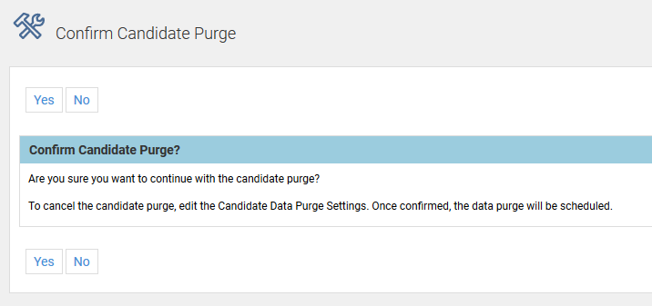 NOTE: The Candidate Purge performs the same delete as if you manually deleted a candidate record. The records cannot be restored. Therefore, please carefully consider your settings for this feature. No purge will actually take place until the confirmation happens. If you have the purge scheduled weekly, and an initial list is generated, but not confirmed, when the task runs the next week to generate the list, the initial list will be overwritten. Because the first list was never confirmed, those same candidates should appear on the next list, along with additional candidates, if applicable.