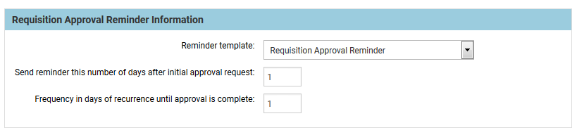- In the second option, choose a frequency for how often the reminder is sent. In the following example, the reminder email will be sent to the current approver just one day after the initial request for notification. It will continue to be sent each day until the approver approves or rejects. A zero option in the second input box would mean that the reminder would not continue after the first reminder.