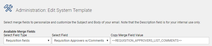 - For any template using the merge field <<REQUISITION_APPROVERS_LIST>>, replace this with the merge field <<REQUISITION_APPROVERS_LIST_COMMENTS>>,which is available from the Requisition fields drop down.