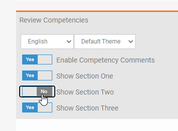 - There are Yes/No options for all three competency sections. Click the option to change the value to No for any section you want to hide from Employees.