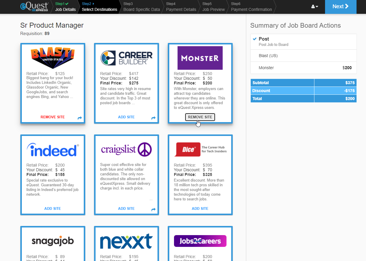 - Customers will be redirected to a new, on-demand job distribution tool called eQuestXpress, which offers the same job posting for free in the US-only BLAST! Networ, but also other discounted, pay-as-you-go job boards