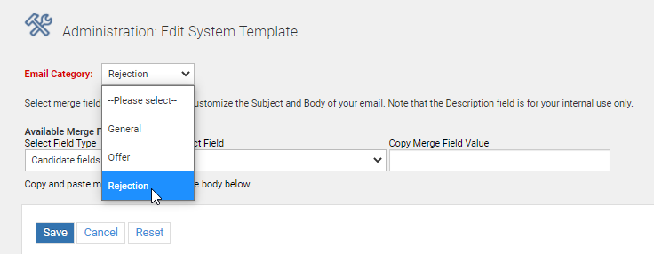 - If needed, create other email templates for the purpose of rejecting a candidate. You may wish to have a different email template for internal versus external candidates; or different templates for a candidate who has been interviewed than one who was rejected earlier in the process. Each of these templates should be marked as 'Rejection' for the Email Category.