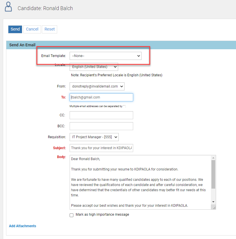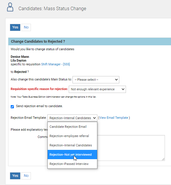 Recruiters can now select a specific email template when rejecting a candidate. As part of this feature, system email templates can now be designated as "Rejection" emails, and only those templates will be available to select when rejecting a candidate. This feature is available both when using the 'Next Step' to reject a candidate, and when selecting one or more candidates from the list of candidates for a specific requisition and then changing their requisition-specific candidate status.