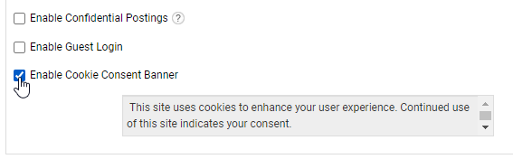 - At the bottom of the Settings section, check the option 'Enable Cookie Consent Banner.' A box will appear with the text that will appear on your Career Center. This text is not configurable.