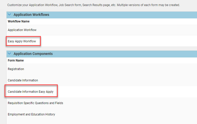 New requisitions will default to this workflow for this Career Center. However, existing requisitions that are currently posted with a specific application workflow will continue to use that workflow. You must edit the requisition, select the Easy Apply Workflow from the list for a given Career Center, and save the requisition to change the application.