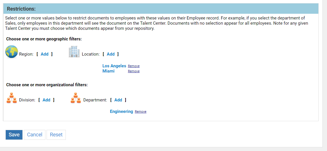 However, when selecting geographic filters (at the top) along with organizational filters (at the bottom), this functions as an AND statement. In the below example, the current document will appear for all employees in either the Los Angeles and Miami locations only if they are also in the Engineering department.