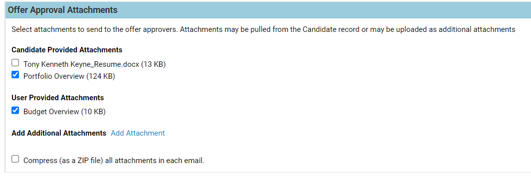 Select the documents you want to add, and optionally choose to zip the approval attachments. Please note that if you choose the zip file, the offer letter itself will appear in the email separate from the zip file to more easily identify it.