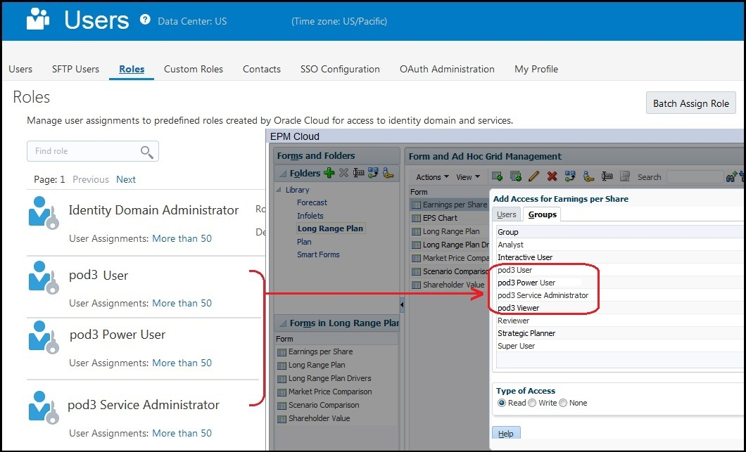 Using Groups created in Access Control, EPM Cloud supports application-level access control for planning, consolidation and close, tax reporting, and Oracle Enterprise Data Management Cloud applications. In addition to the custom groups created in Access Control, access control screens list predefined identity domain roles (Service Administrator, Power User, User and Viewer) as groups.