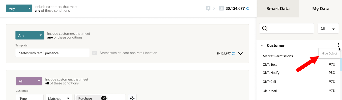 Instance Admin users can now configure which data objects and attributes are available in segments for business users to use.
