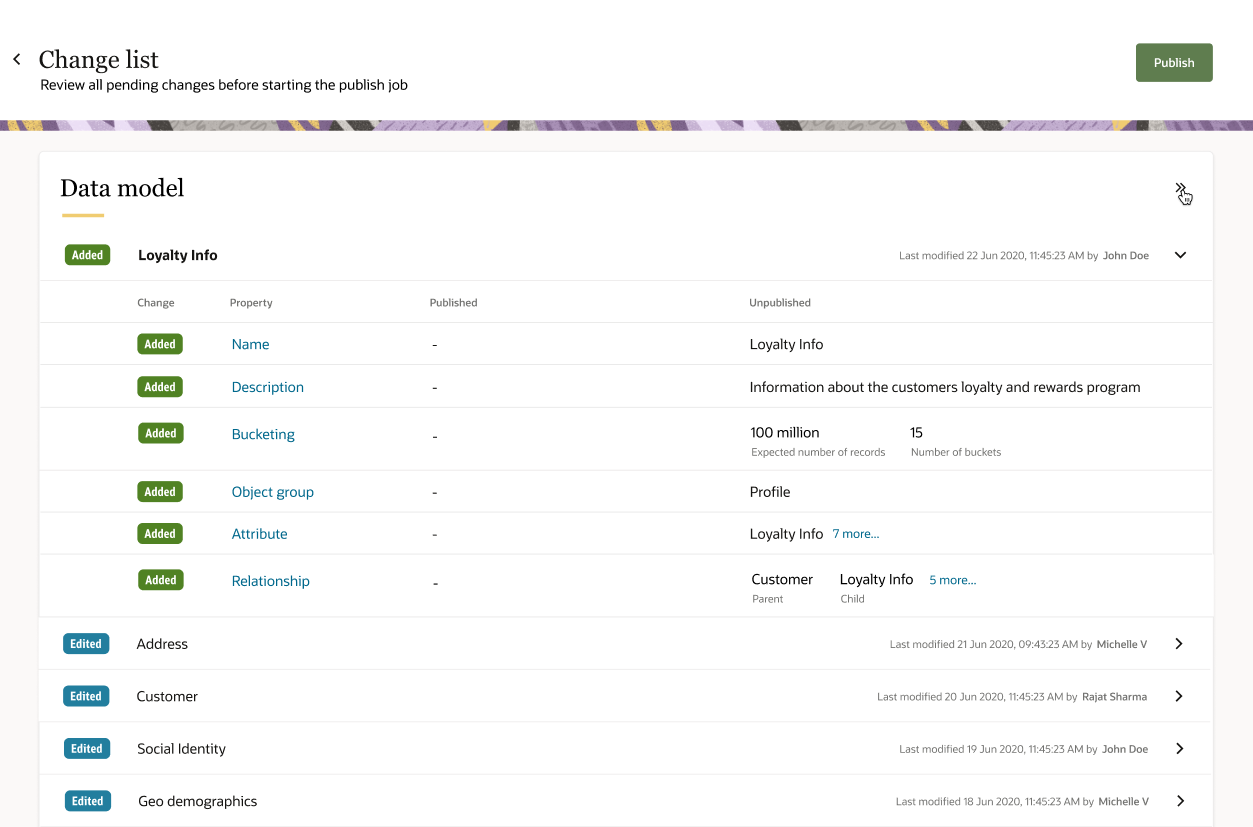 Change list displays changes made to the data model jobs, intelligent attributes, and profile unification pipeline.