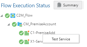 The image shows the Test Service option of Conversational Test Data Entry. You can right-click a component in the Flow Execution Results to display the Test Service option.