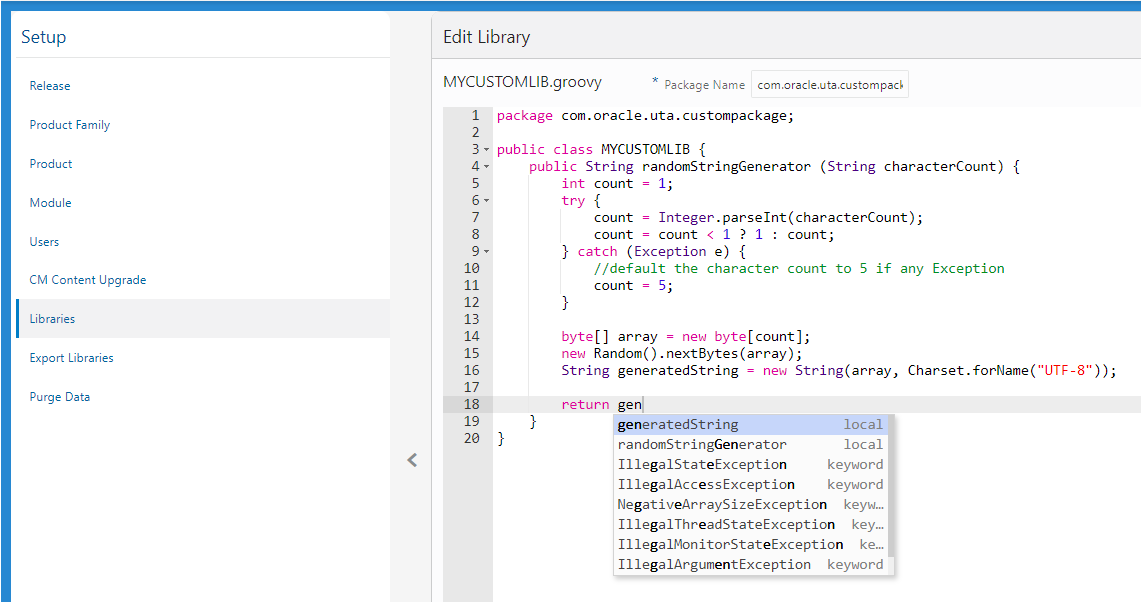 Oracle Utilities Testing Accelerator adds a code editor that enables you to create custom Groovy functions or libraries and update the Function Library code within the Oracle Utilities Testing Accelerator workbench. Additionally, you can now export a custom Function Library from one Oracle Utilities Testing Accelerator instance to another instance.