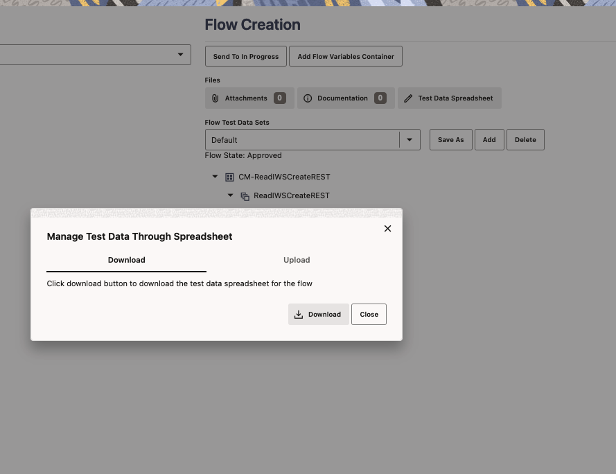 Spreadsheets can now be used to add and update test data in Oracle Utilities Testing Accelerator. The supported spreadsheet format is the Microsoft Excel format (.XLSX), which provides a versatile formatting for easier input of test data. Each flow has a download spreadsheet option that allows you to download a template corresponding to the flow definition. Each worksheet in the spreadsheet corresponds to the test data pertaining to an individual component in the flow. Test data can be added and updated for test data sets in the flow. You can also create new test data sets in the spreadsheet. Once the spreadsheet is updated with appropriate test data, you can import the spreadsheet to update the test data in the flow from which it was downloaded.