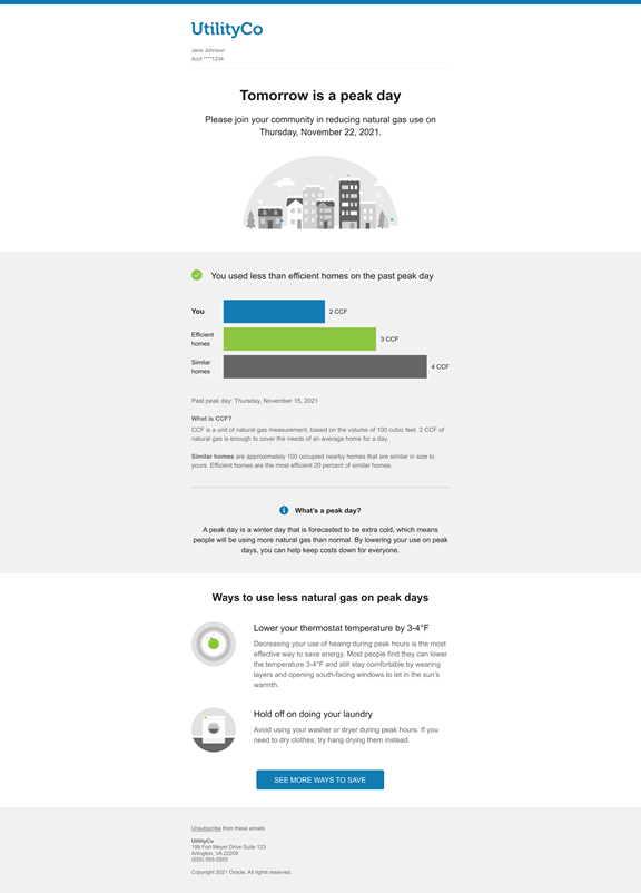 Winter Gas Behavioral Demand Response uses gas AMI data to encourage customers to reduce their natural gas use during the coldest days of the year. This feature uses pre-event communications to inform the customer of when a winter gas peak-demand event will occur, and post-event communications to tell the customer how they performed compared to their neighbors or community during the peak event. These communications can help reduce the risk of gas shortages, defer or eliminate the need for infrastructure investments, and mitigate customer complaints related to gas shutoffs. A non-AMI version of this feature is also available, when delivered in conjunction with the AMI experience.