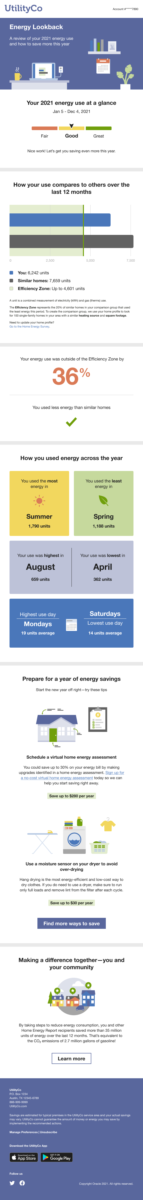 The Annual Report educates customers about their energy use in the previous calendar year, and advises them on the most impactful actions they can take to successfully save energy and money in the new year. It also includes a community message that reminds the customer that their efforts contribute to a massive collective impact. The Annual Report is delivered in January and recaps up to 12 months of data from the previous calendar year.