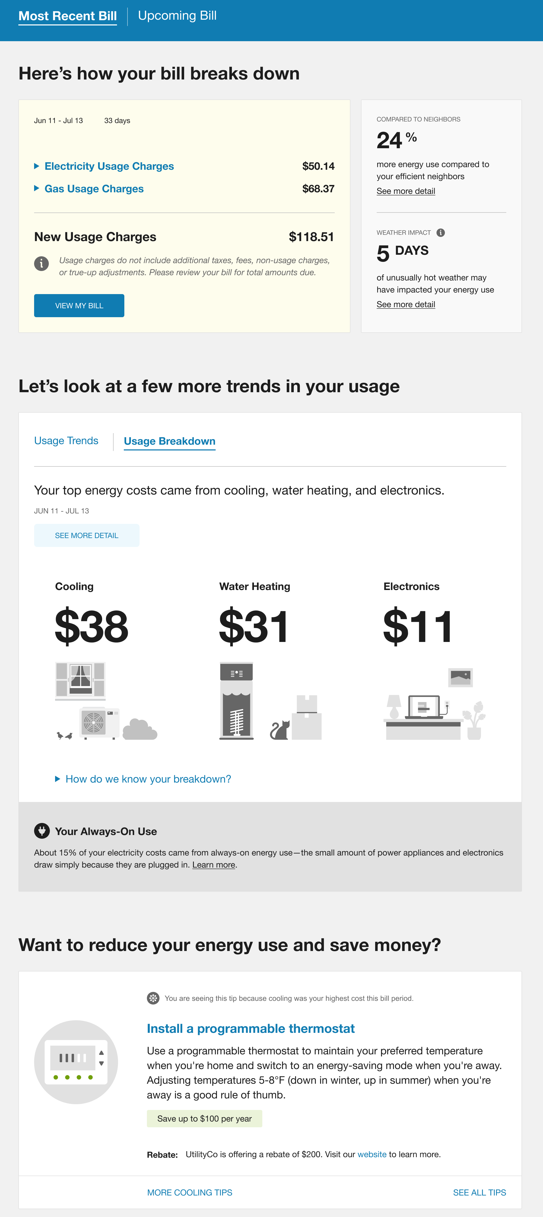 - Top End-Use Tip: An energy efficiency tip based on the customer's highest end-use category from the most recent bill period.