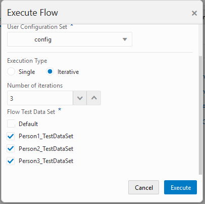Iterative Execution is available for browser-based execution of Oracle UtilitiesTesting Accelerator flows. You can find the iterative execution option in the Execute Flow window and configure the following settings: