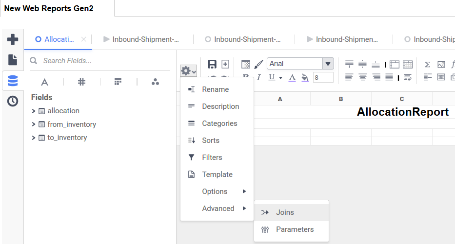 A new alias option allows you to include the same category multiple times in a report but with different names. This is similar to using aliases in SQL statements. For example, the allocation table has two fields from_inventory_id and to_inventory_id that both refer to the same inventory table (allocations map inbound inventory to outbound). To create a report that shows both inbound and outbound inventory information related to allocations, the inventory table can be joined twice with the allocation table using these two columns and using an alias for the inventory table such as inbound_inventory and outbound_inventory.