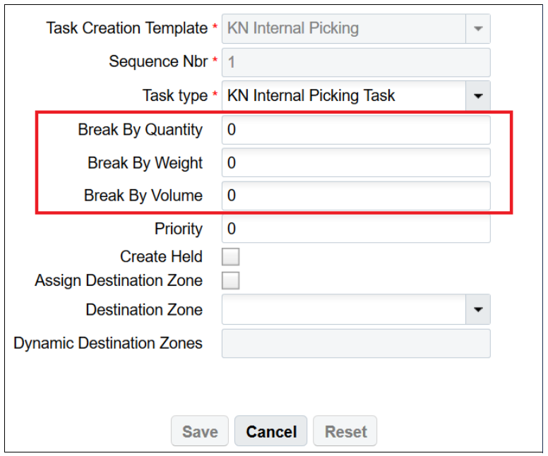 - For example, if only break by weight is needed for task creation, the appropriate value can be updated for break by weight and break by quantity, break by volume can be made zero/blank.