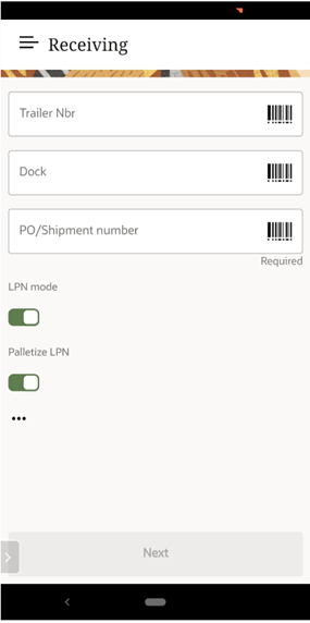 In this transaction, you are prompted to scan a Trailer Number, Dock Door, and Purchase Order or Shipment Number. Purchase Order/Shipment Number is a required field. If you scan a Dock Door, and the dock door has been associated with an appointment, then the system will populate the information based on the appointment. If you have the Palletize LPN toggle enabled, you will be prompted to provide a pallet number. In this transaction we introduced a new concept: LPN mode and SKU mode.