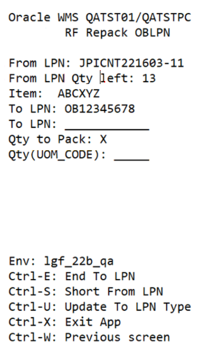 Pack All SKU Quantities Into an Outbound LPN Using RF Repack Outbound LPN |