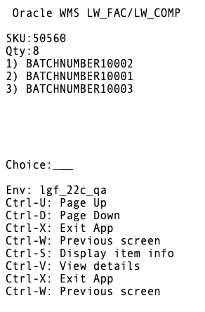 To enable RF prompting of batch selection, set the “Select Batch” screen parameter to Yes (and the existing screen parameter “item-barcode-scan” to Prompt SKU/Scan Each SKU.)